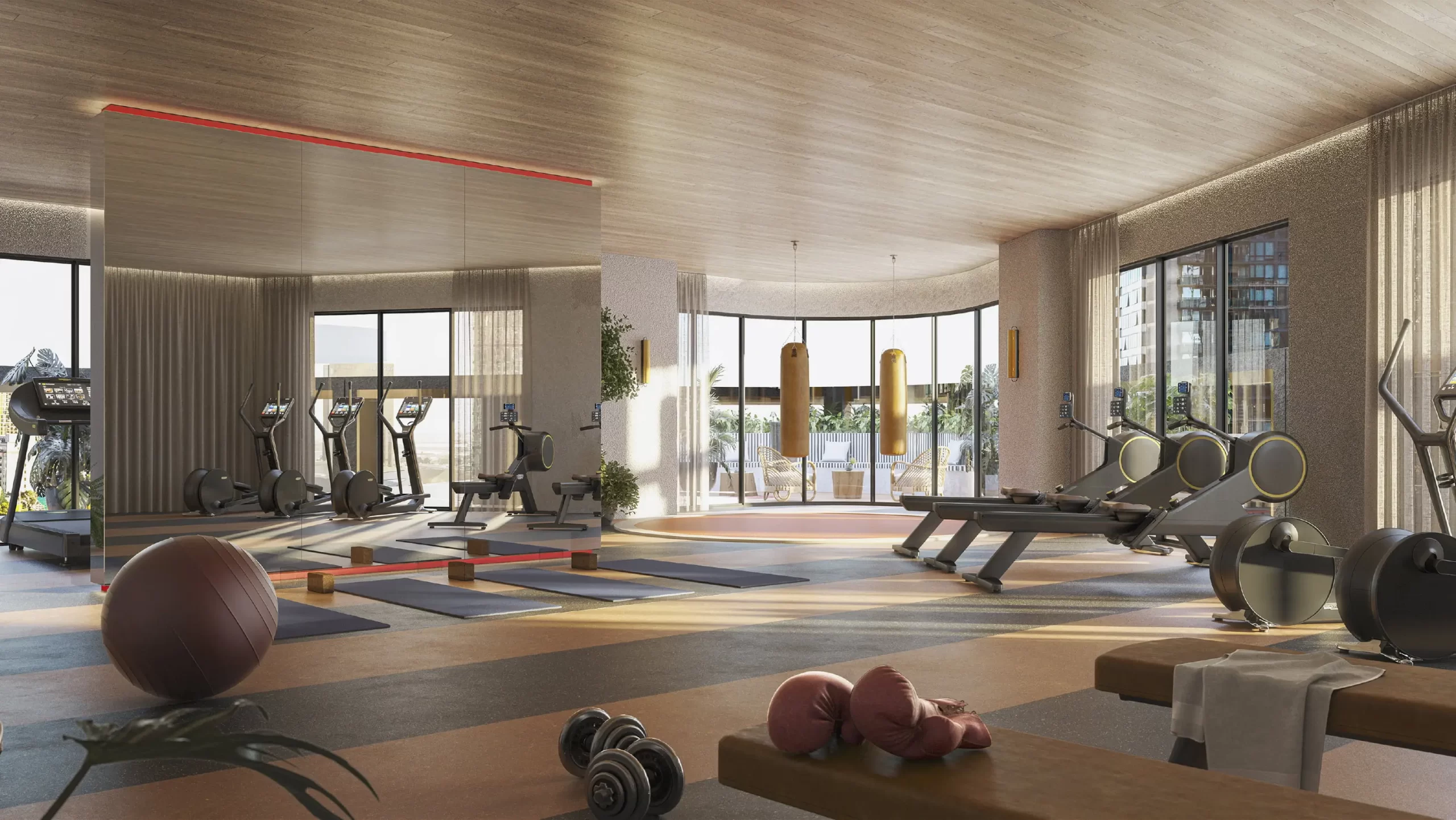 - Phòng gym hiện đại, khu tập Pilates và Yoga hướng ra cảnh quan vườn.